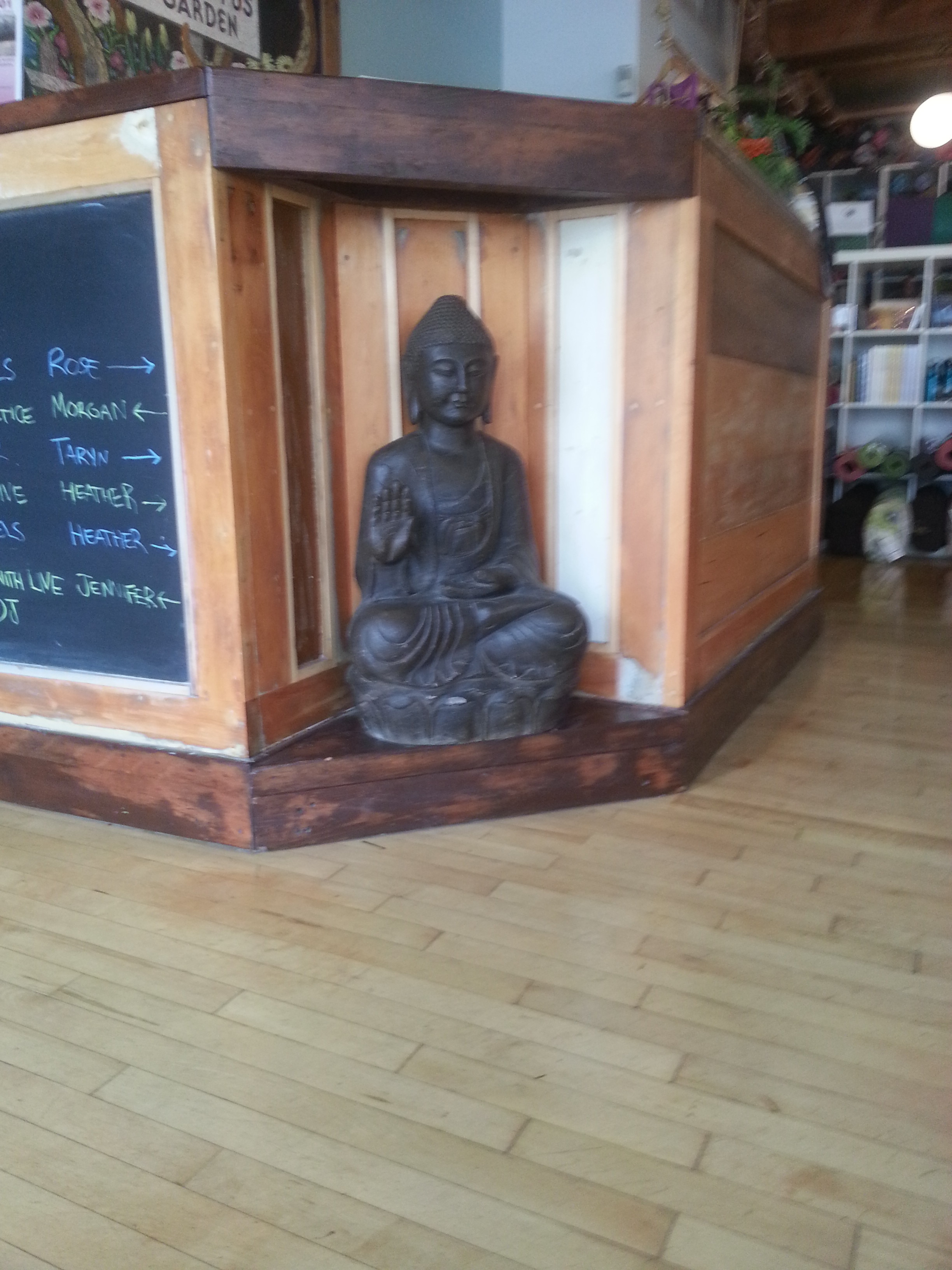 While babysitting went to a yoga store to buy a special back massaging gizmo for my poor sore back and at the front of the store there we saw a small statue of the Buddah in the lotus position with one arm horizontal and the other vertical with the palm open. My daughter walked up to it and said,