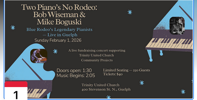 | May 1 | Welland | The Bank Art House | Two Pianos no Rodeo | https://www.eventbrite.ca/e/two-pianos-no-rodeo-bob-wiseman-mike-boguski-tickets-1985461144731?aff=oddtdtcreator |