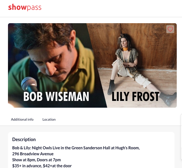 | May 14 | Toronto, ON | ![]() | w Lily Frost | https://www.showpass.com/bob-lily-night-owls/ |