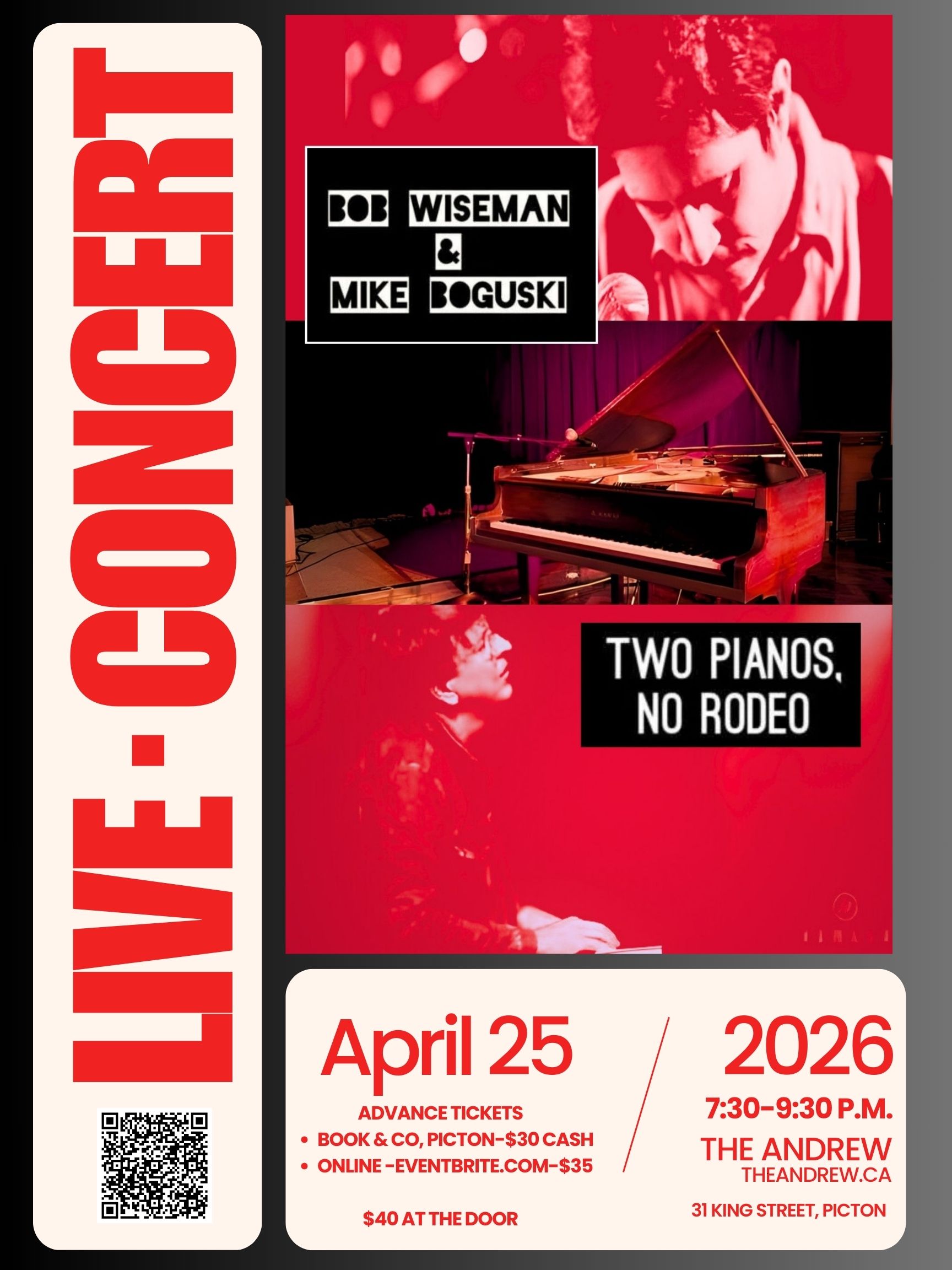 | April 25 | Prince Edward County | The Andrew![]() | Two Pianos no Rodeo | https://theandrew.ca/calendar |